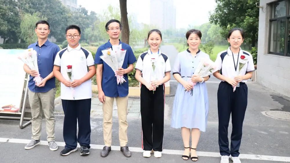 ▲学校领导班子成员和学生代表分别在南北校门处为老师们送上鲜花