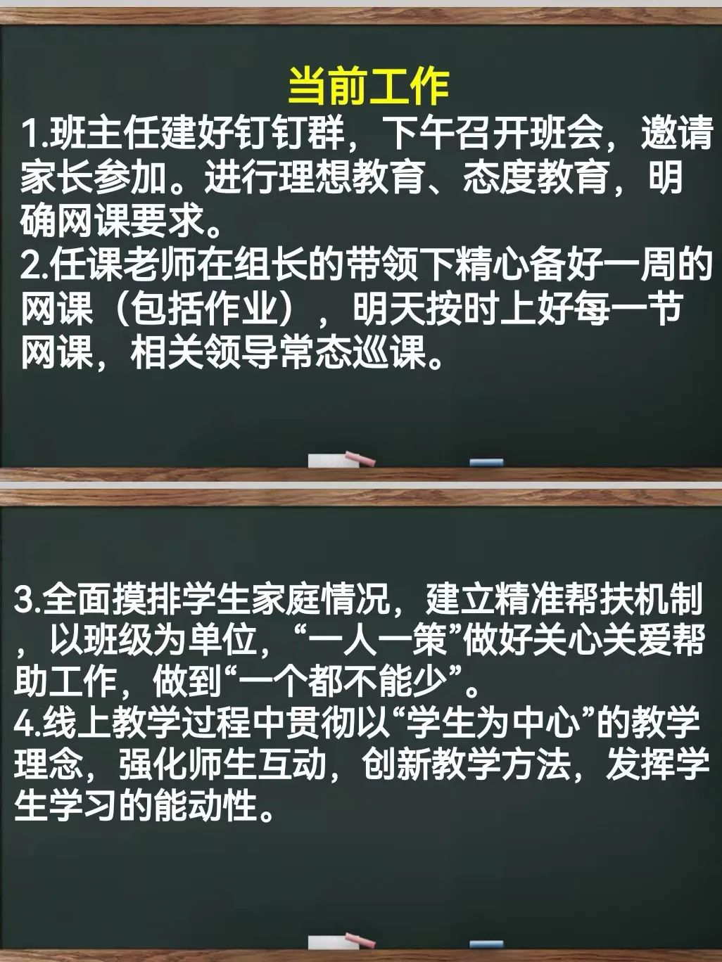 下午,按照校长室的部署,所有工作紧张而有序地展开:分管九年级的刘金玉副校长、梅洁副书记召开九年级全体教师会,分析上学年的得失,明确本学年的目标,提出线上教学的要求;备课组长带领组内老师精心备课,梳理教学重难点,探讨网课的实效性,力求在线上教学中贯彻“以学生为中心”的教学理念,强化师生互动,创新教学方法,发挥学生的学习能动性;班主任建好“钉钉群”,邀请家长一同参加线上班会,对学生进行理想教育、态度教育,明确线上学习的各项要求;班主任会同任课老师全面摸排学生家庭情况,“一人一策”建立精准帮扶机制,做到“一个都不能少”。