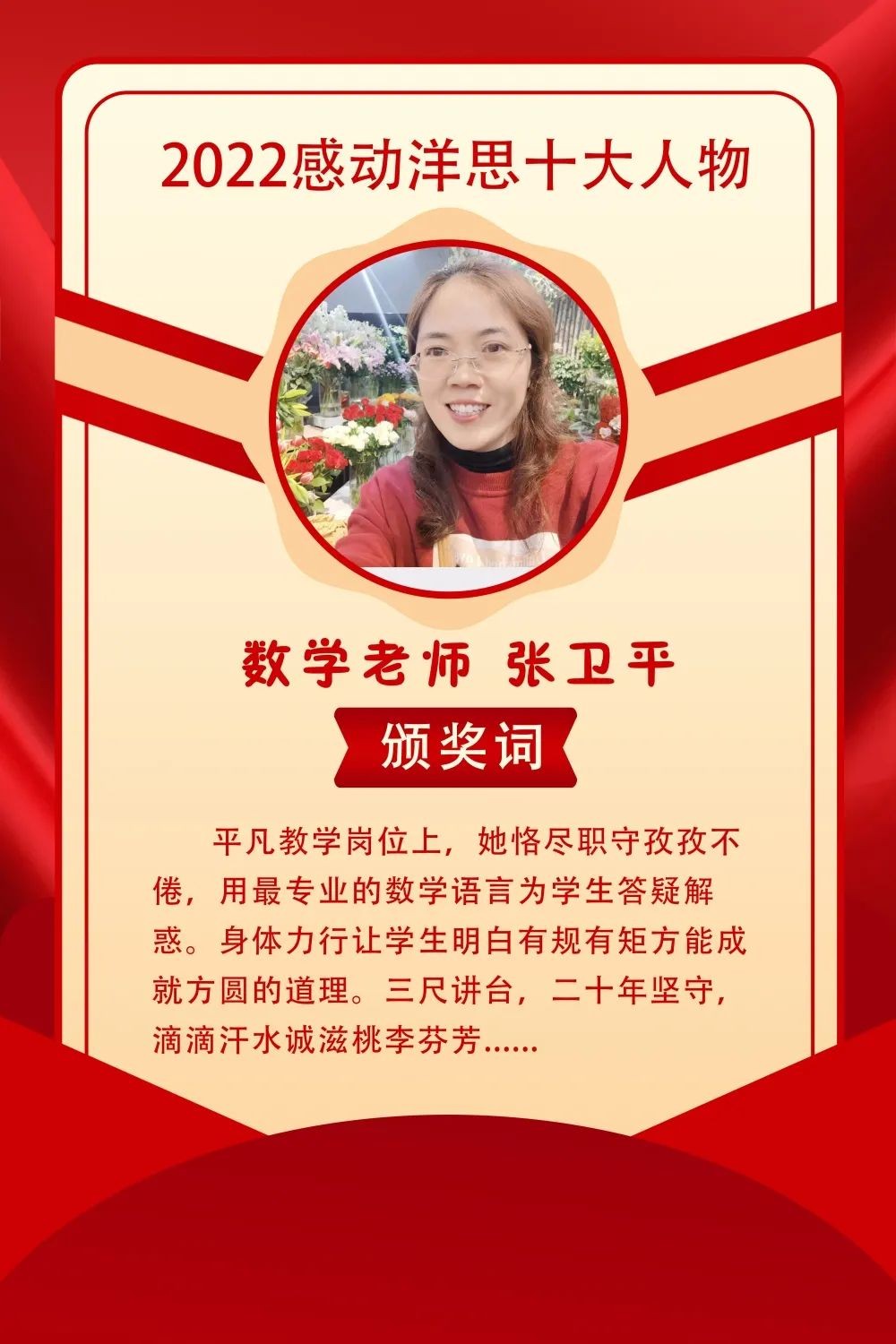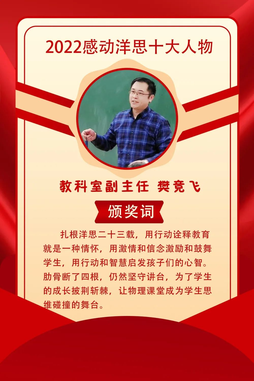 今天是一个激动人心的日子,在各级部门和老师的推举下,我们从各个层面选出了10位老师作为代表,其实,洋思的每一个老师都如他们一样:为了学生,忘了自己的孩子;为了工作,忘了自己的家庭,因为洋思,日夜奉献。值此教师节来临之际,我代表学校党总支,向全体教职员工表示最衷心的祝福和感谢!