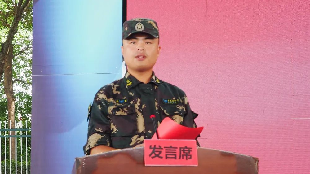 教官领队代表全体教官发⾔:全体教官将严以律⼰,以饱满的精神状态和良好的军事素质做好表率,并让⼤家掌握⼀定的军事知识和技能,养成雷厉风⾏的军⼈作风和⾼尚的道德情操。